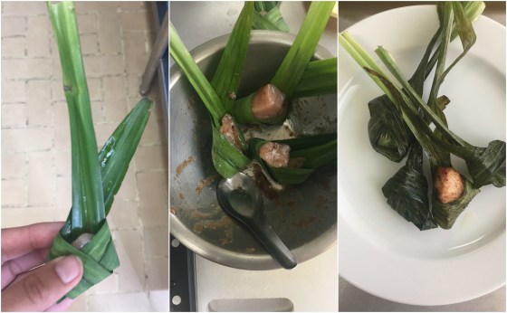 We started with chopping up some onions and garlic and mixing it with some spices to add to our chopped chicken. We mixed it, wrapped them all up in leaves and left them in a bowl to marinate while we worked on other things. We came back later and cooked our chicken in oil for just a few minutes until browned.