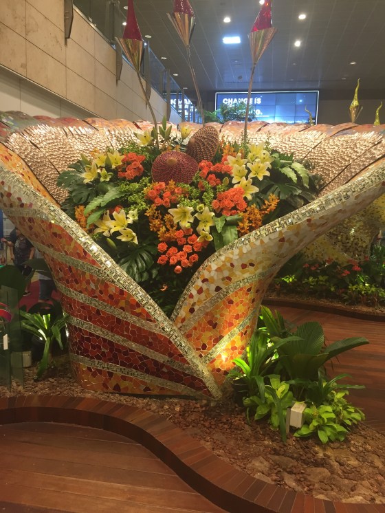 The flight was long (14.5 hours!!) but great. The food was tasty and there were so many choices! They had a bunch of great in-flight movies and entertainment, but for the first 6 or so hours I slept. We had a quick layover in HongKong where we got Starbucks and freshened up. I felt like a new person with freshly brushed teeth and hair and a clean shirt. We had a much shorter flight (4hrs) to Singapore where we had our longer layover (4 hours). It was middle of the day when we arrived, so we decided to get some steps in at the airport and explore. I was blown away by how many shops, interactive displays and interesting decorations the Singapore Airport had.