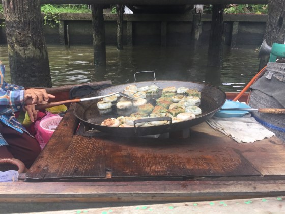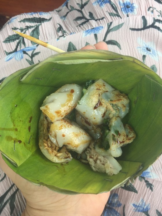 It was a warm day, roughly 88 with humidity, but the cool air and light spray from the water was great on the boats. Standing still and listening to Nui at each spot was a little warmer. My hat kept me cool and shady, but we had to have covered knees and shoulders for the various temples. The sun slid in and out of the clouds as we tried to stand in the shade of the trees. From the forest temple we jumped back into the boat, and on our way to the next stop, we passed some boats that were cooking food. We stopped and tasted two different dumplings: chive and taro with a chili oil sauce. The dumplings were steamed and then pan friend right before eating to ensure a crispy taste. They were served in a banana leaf bowl and were delicious! I almost wanted a second one, but I knew there was more food coming.