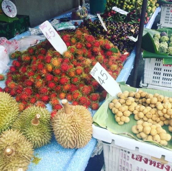 Our first stop was at the Wat Sat floating market, that due to flooding in the canals and the consequent building of flood locks was permanently moved to land. We were blown away by the exotic fruits they had: mangosteen, rambutan, pineapple,dragonfruit, lychee, and longan.