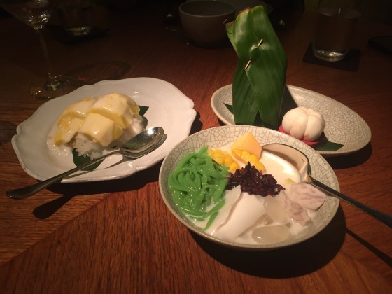 We ordered dessert, one I was familiar with (mango and sticky rice!) and one new one with corn, rice, mangosteen and coconut cream. Our service was great, and the whole restaurant was very modern and elegant.