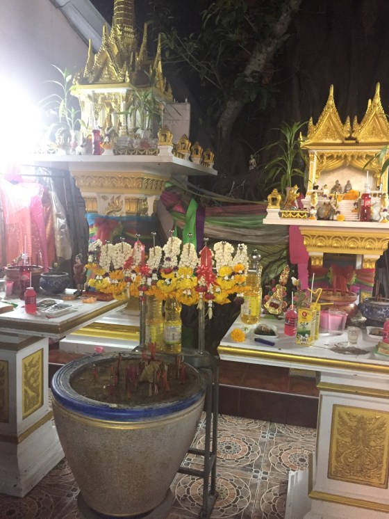 We started at a small market called Klong San Market that had fresh fruit, prepared foods, some clothes and other odds and ends. Net told us about the Thai’s devotion to King Rama and how they are in mourning for his death this past October. She showed us a small prayer room, and various alters where people leave things as gifts to the Gods.