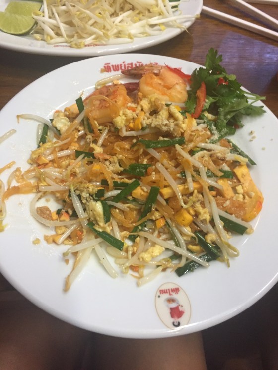 There were six or 7 chefs cooking outside the restaurant and a few more inside making endless rounds of pad-thai. They even offered one with pad thai wrapped up in an egg omelet. Net helped us order and then we sat down at a table inside. Clearly this tour group had done this before as it was a smooth transition for us luckily! Our food came and it was delicious!