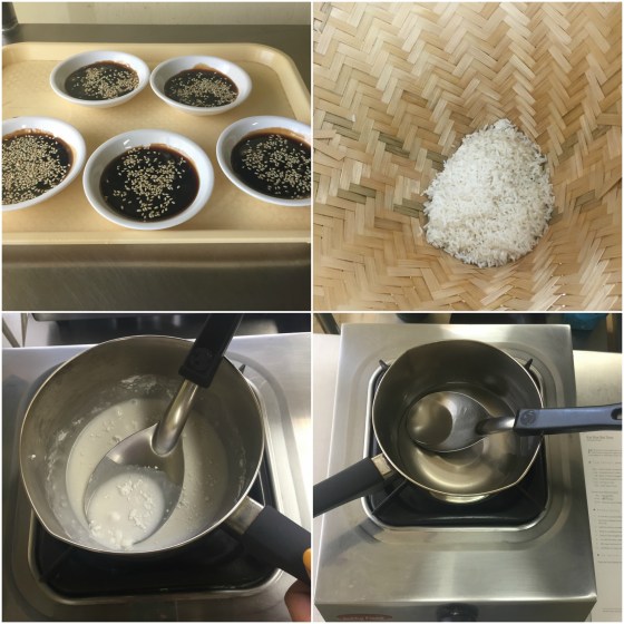 Next we worked on the various sides: emerald chicken sauce, cucumber relish and the sticky rice. The emerald chicken sauce was pretty easy, as was the cucumber relish (mix up vinegar, sugar and salt with diced cucumbers, peppers and onions. We started the rice cooking in a double boiler as we worked on the creamy sweet sauce in a different pan. Chef Mae had already pre-rinsed and soaked the rice for us, so cooking of all the sides went quickly.
