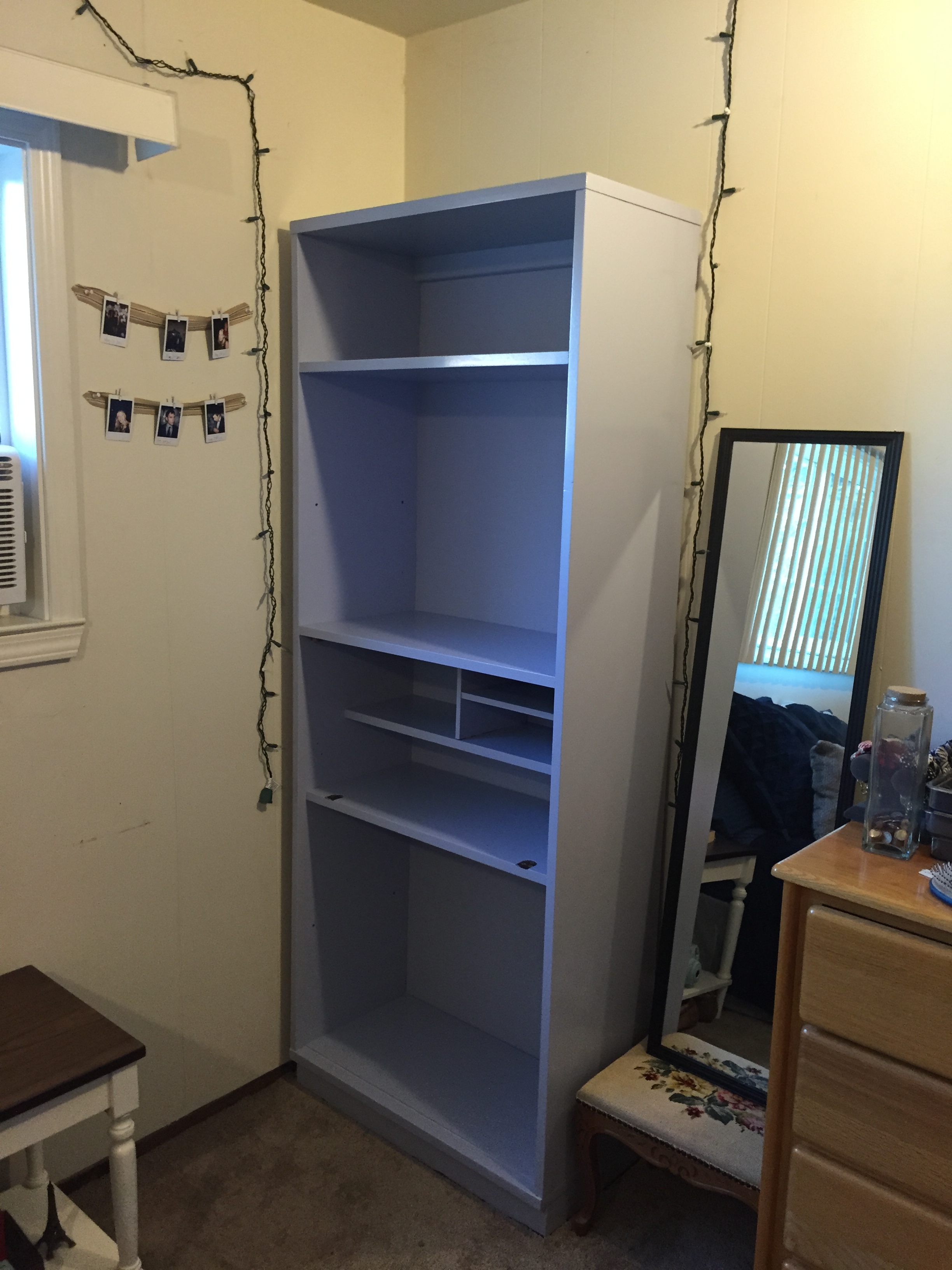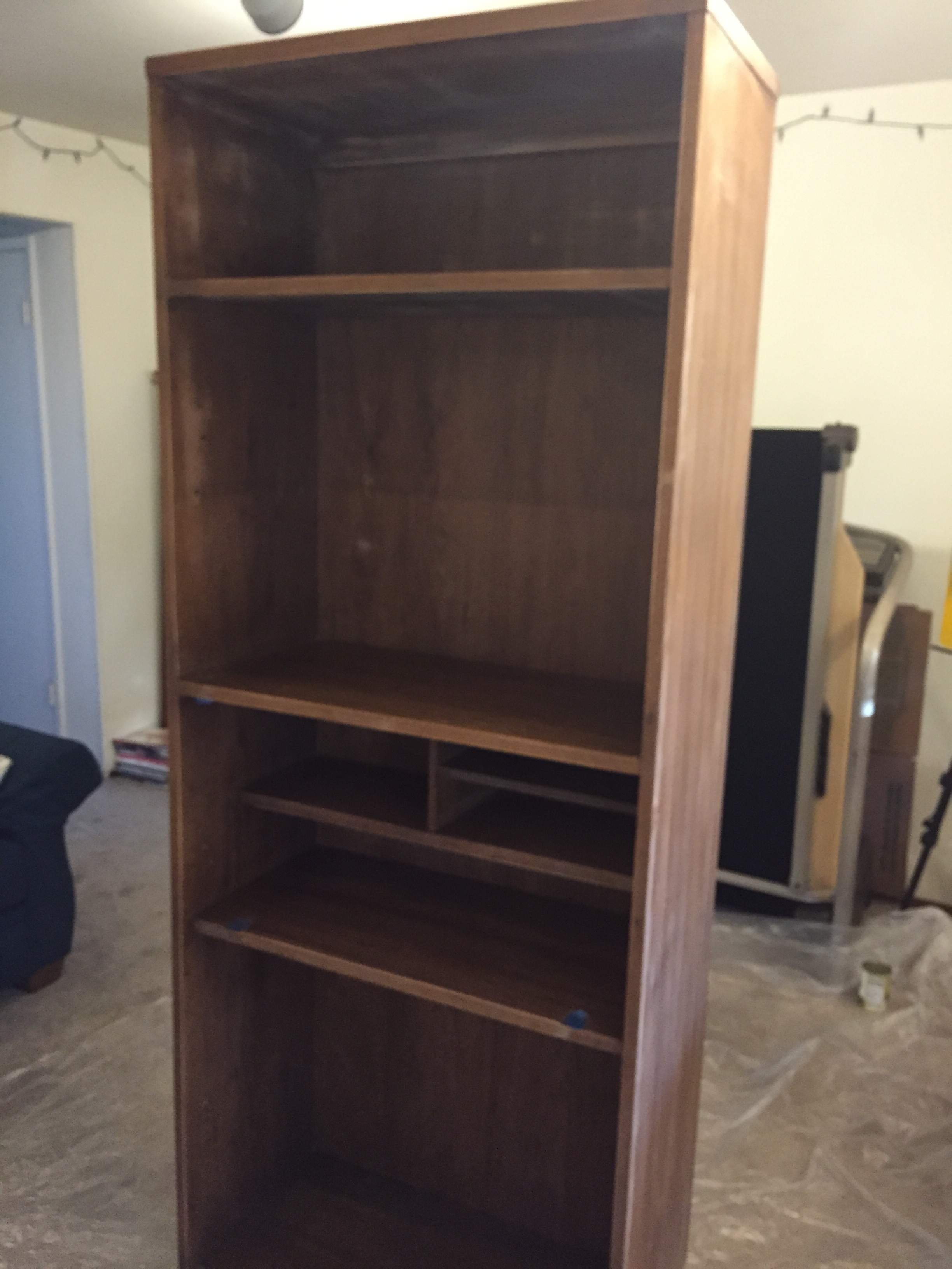 After it cooled a bit, I started a project that I had been itching to tackle. Painting a walnut bookshelf a new pretty color! I had Robert help me sand it, and then I painted it a beautiful grey-blue. That middle part is a makeshift desk with cute cubbies.