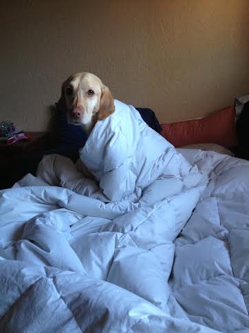 After dinner, I was sitting on my bed finishing signing all the paperwork for my new job. It was such a large pile, that eventually Nala got covered up. (She loves being covered; the sheets, warm laundry, my paperwork!)
