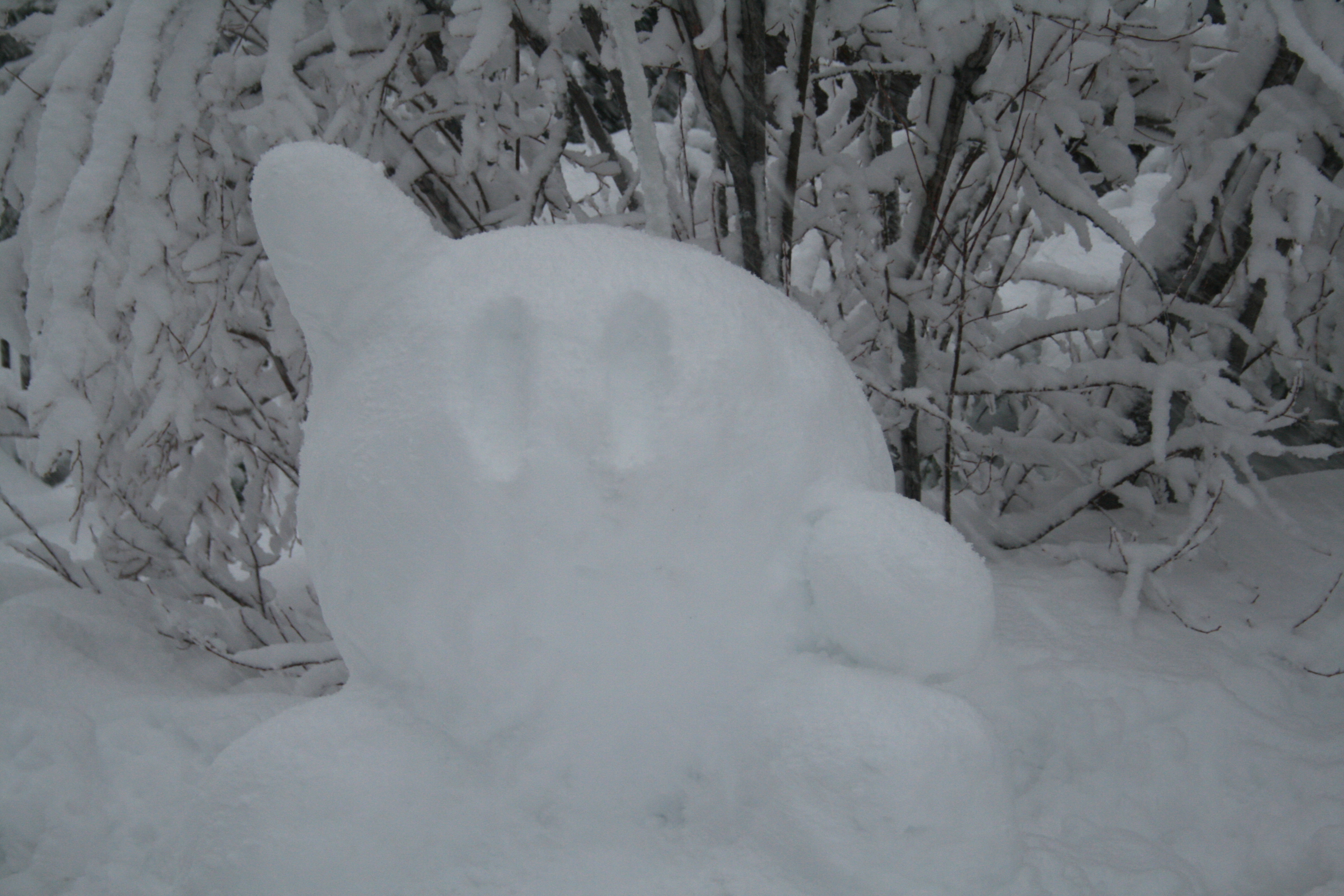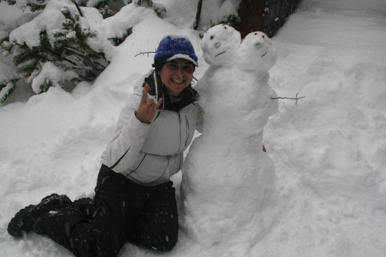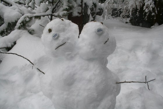 The new snow transformed everything into a sleepy wonderland. We slept in, made tasty food, and watched the Winter Olympics while it snowed. Later on Saturday, we played in the snow, had snowball fights, sledded down the the hill in the backyard, and built some funny looking snow-women, in our case. Annie and I made Dwight, a two-headed dinosaur woman complete with a spiky tail. Adrian made a handsome Kirby. Huyson joined us later in the day after we rescued him from not one, but two sticky spots on hills.